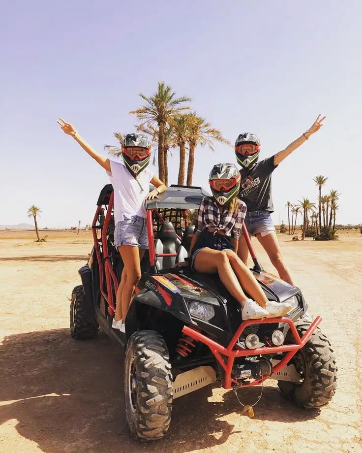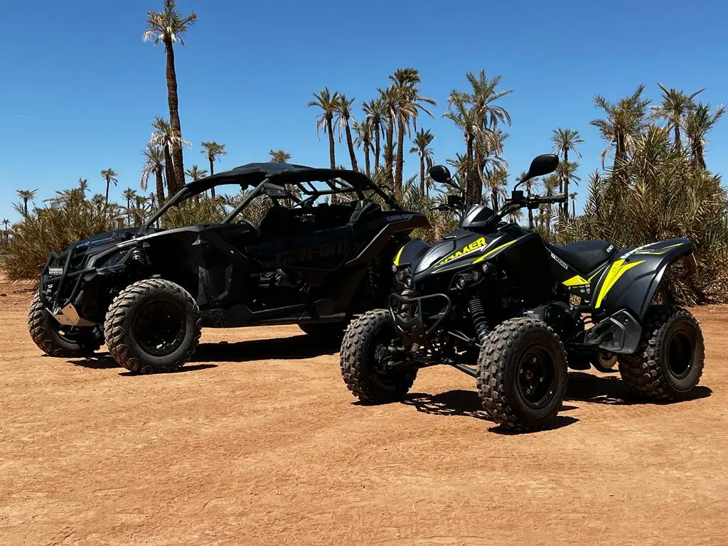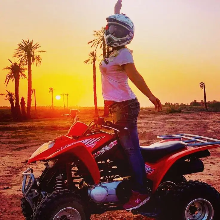 Discover the Agafay Desert with thrilling quad and buggy rides, a peaceful camel experience at sunset, and a traditional Moroccan dinner under the stars, enhanced by an unforgettable fire show.